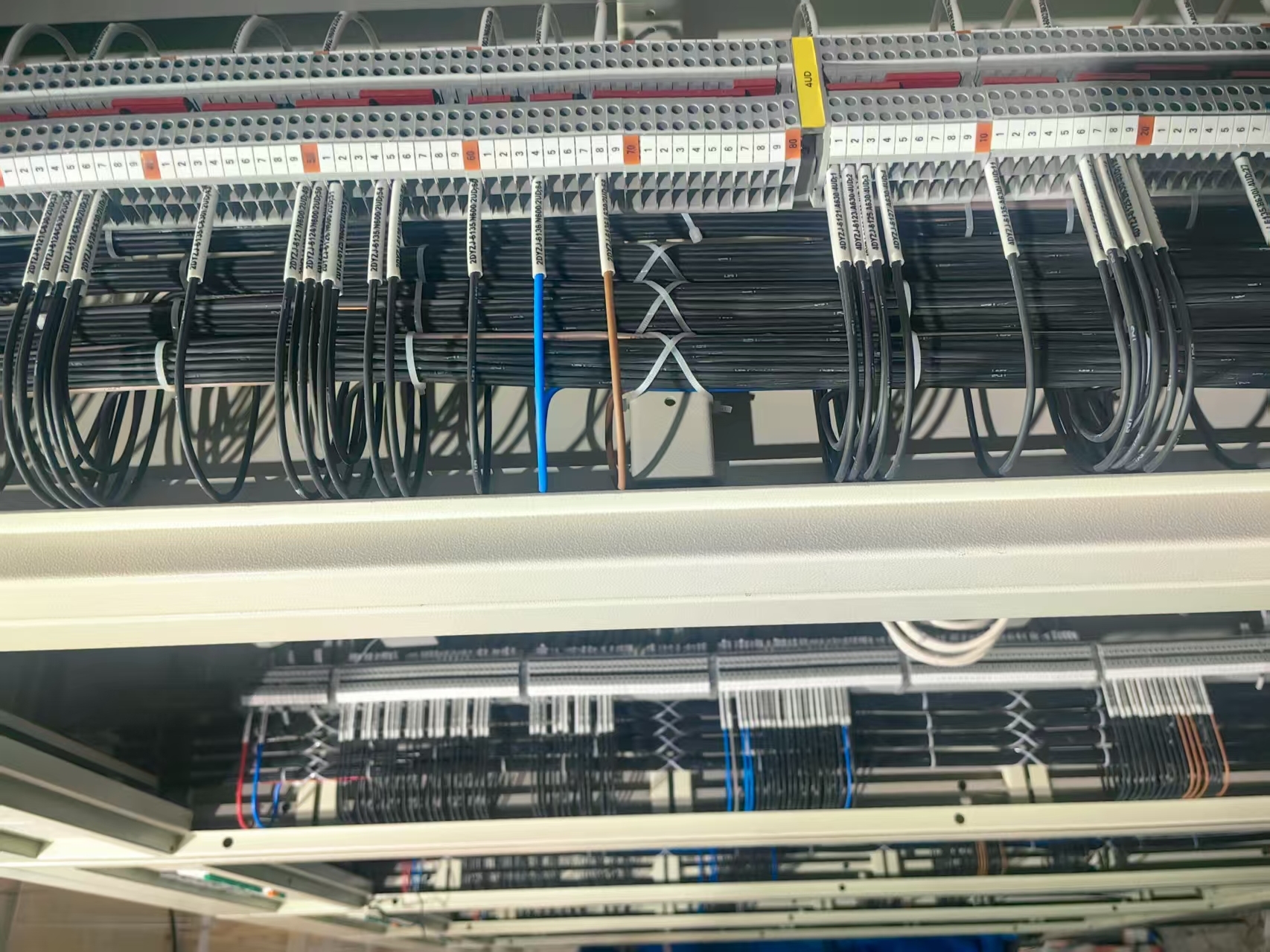 細節上更是精益求精,他們團隊敷設的紅色熱縮管統一截取長度誤差不超2毫米,備用芯線帽排列如列陣士兵,連綁扎帶的傾斜角度都嚴格控制在30度,敷設質量和接線工藝得到了監理、總包和業主的高度認可。
